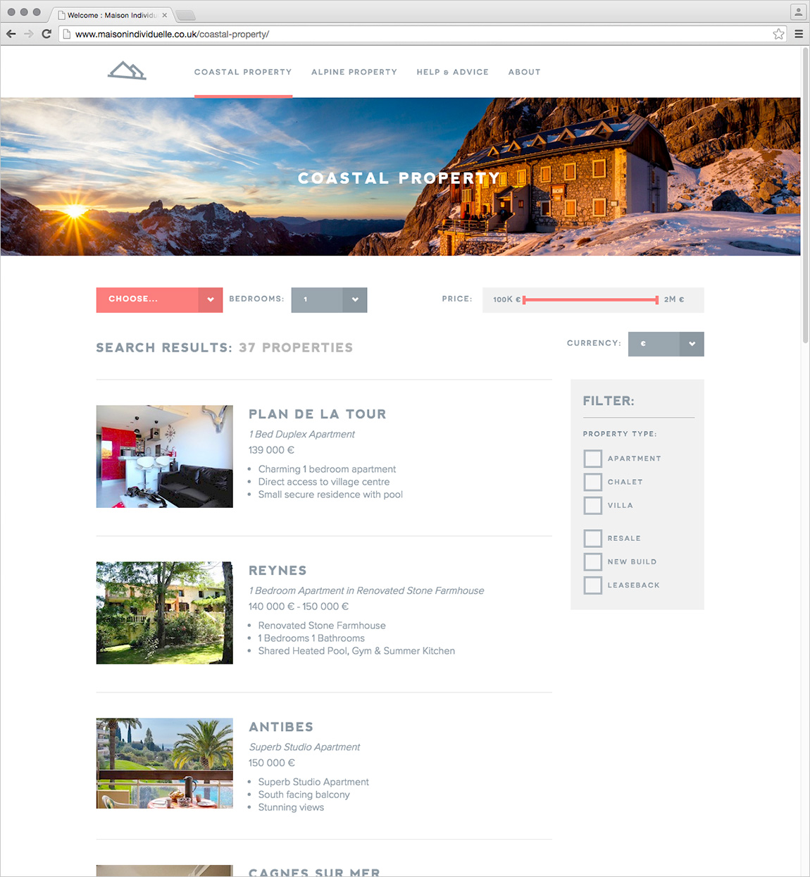 For over 30 years Maison Individuelle has been helping buyers and sellers with every aspect of their French property sales. Pluspurple was approached to develop a CMS driven, responsive website to show off their range of excellent properties. The design of the website allows prospective buyers to quickly search and filter the property database and reflects the company's high standard of service.